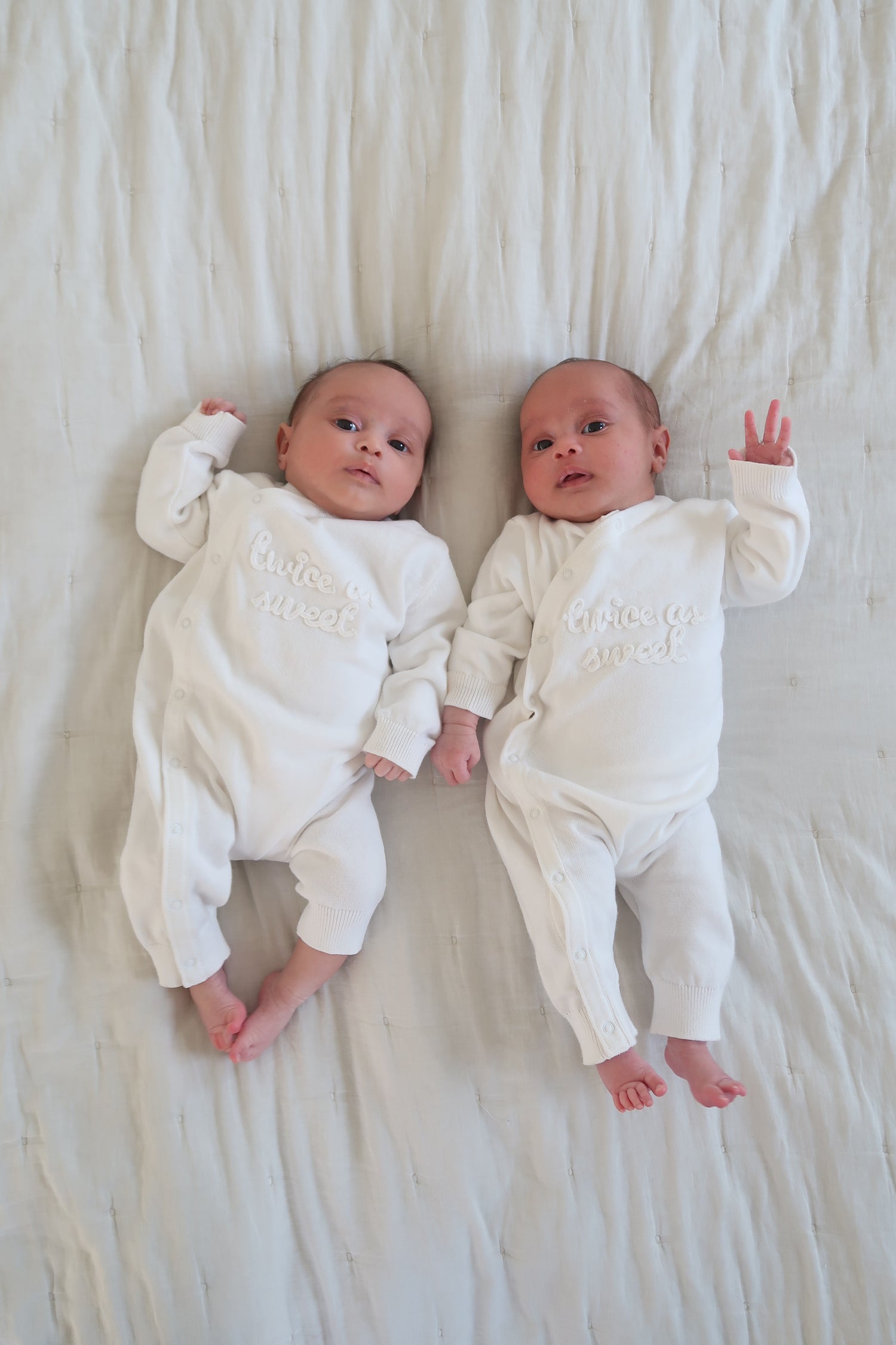 This beautifully knitted organic cotton sleepsuit set honours twin love in its purest form.