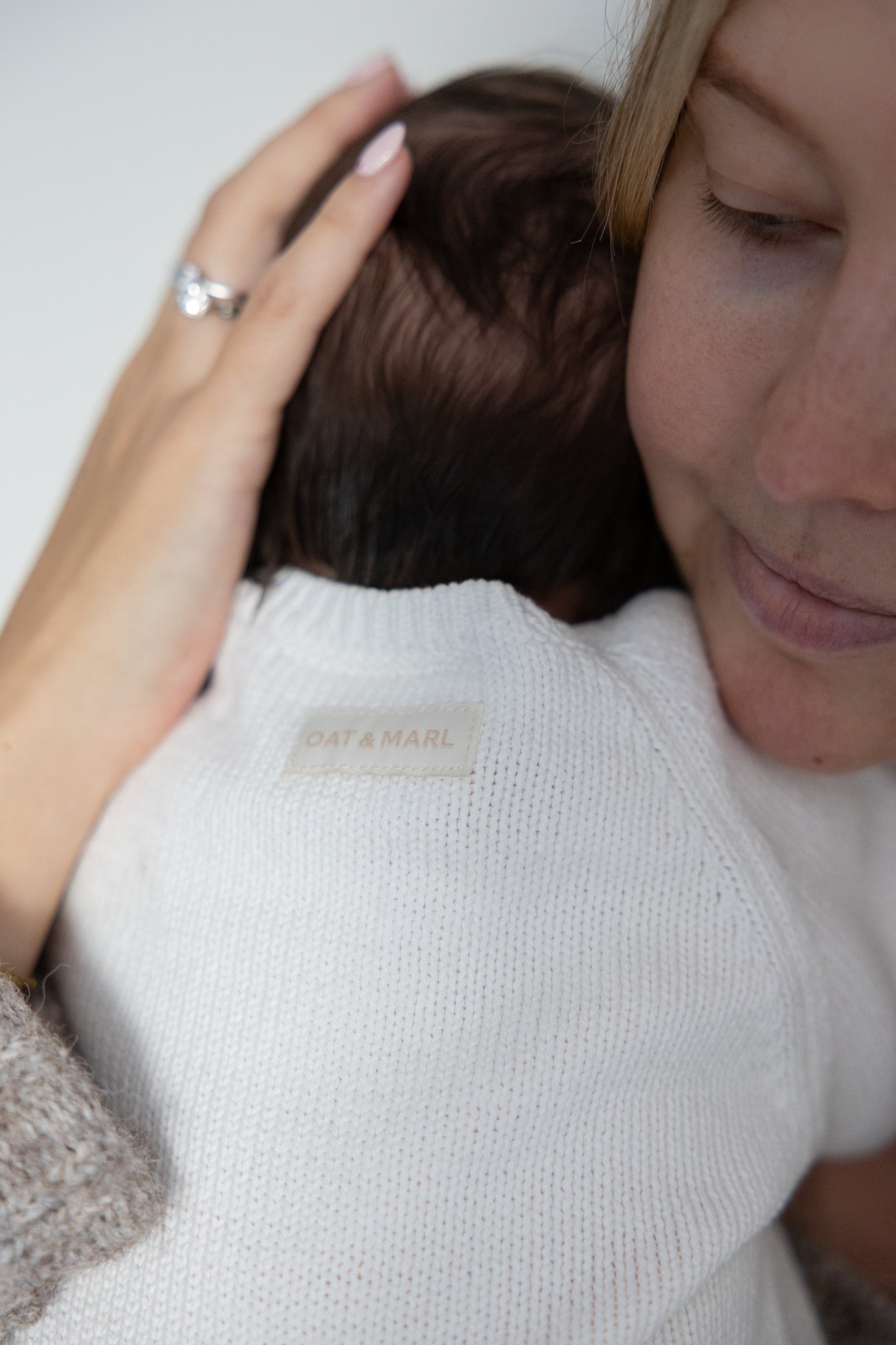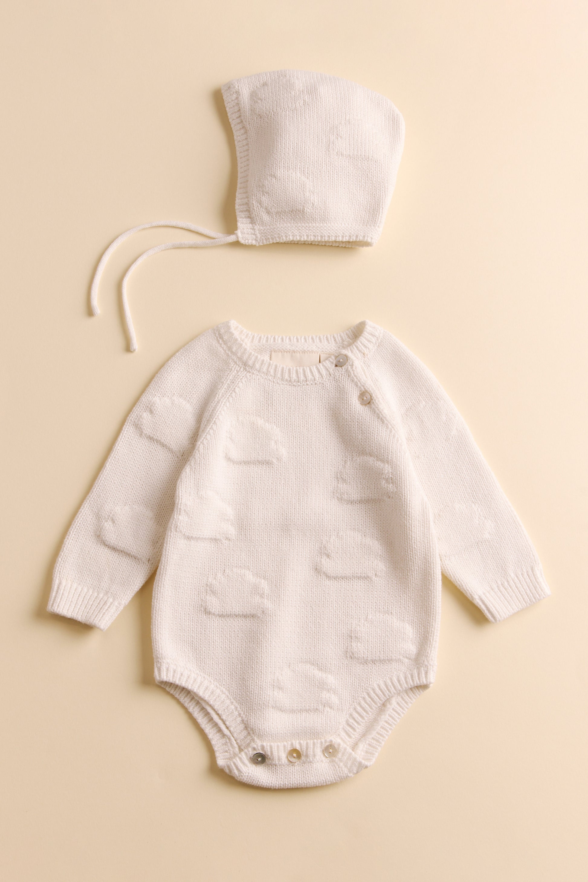 Our White Cloud Intarsia Knitted Romper & Bonnet Set is crafted from beautifully soft organic cotton knit, designed to feel breathable, lightweight and gentle against delicate skin.